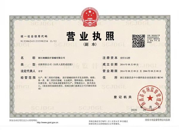 浙江納雄醫療器械生產許可證