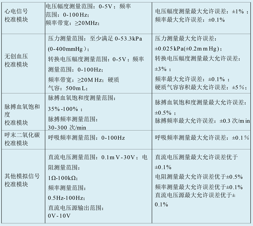 生命體征模擬儀校準裝置是用于校準生命體征模擬儀的上一級標準裝置。生命體征模擬儀校準裝置由心電信號校準模塊、無創血壓校準模塊、脈搏血氧飽和度校準模塊、呼末二氧化碳校準模塊和其他模擬信號校準模塊組成。